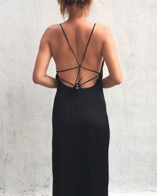 Black Crossback Organic Satin Silk Cowl Neck Slip Dress