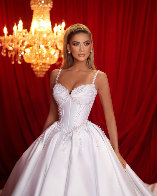 Beautiful A-line Spaghetti Straps Sleeveless Ruffles Satin Train White Long Wedding Dress
