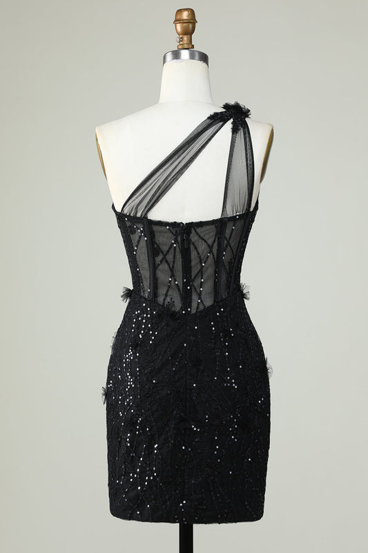 Black Bodycon One Shoulder Corset Short Homecoming Dress with Appliques