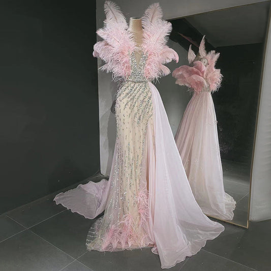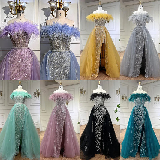 Blue Diamond Feather Mermaid Elegant With Overskirt Evening Dresses Gowns 2025 For Women Wedding Party LA72061