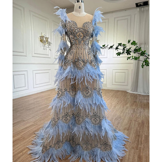 Blue Feather Beaded Evening Dresses Gowns 2025 Mermaid Luxury Elegant For Women Party LA71587