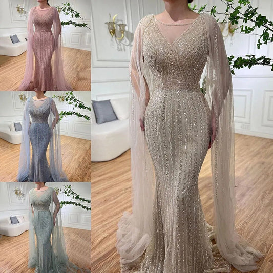 Blue Luxury Mermaid Evening Dresses Gowns2025 Cape Sleeves Beaded Elegant For Woman Party LA71163