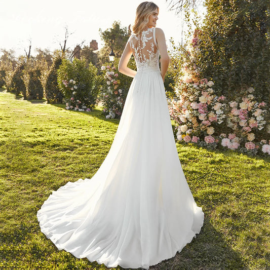 Chiffon Lace Bridal Dresses Deep V-Neck Wedding Gown A-Line Sleeveless robe de mariée bohème Buttons Backless Bride Custom Made