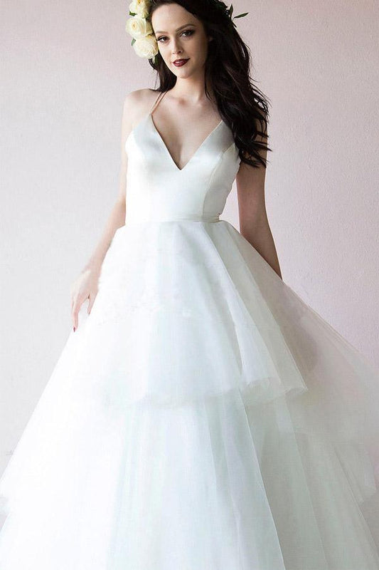 ClassicSpaghetti-Straps V-Neck Wedding Dress Ruffles Chiffon Tulle Designer Bridal Dress