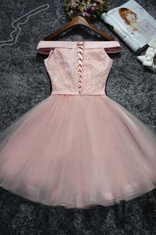 Cute Off The Shoulder A-line Short Pink Lace Homecoming Dress PG143