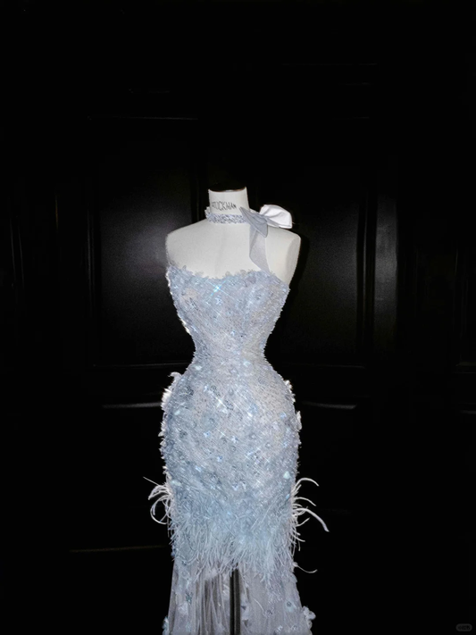 Dream Blue Tulle Beaded Appliques Long Prom Dress,Slit Mermaid Evening Dress Wedding Dress Y8668