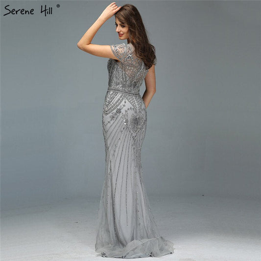 Dubai Grey Mermaid O-Neck Design Evening Dresses Beading Diamond Luxury Cap Sleeve Formal Dress 2025 LA70152
