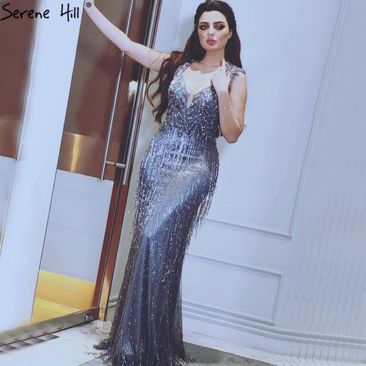 Dubai Luxury Beading Tassel Evening Dresses 2025 Latest Design Silver Mermaid Evening Gowns LA60847