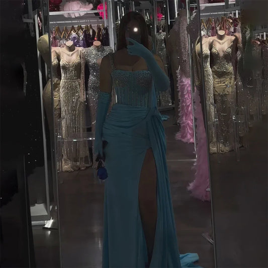 Dubai Luxury Evening Gown 2025 Blue High Split Mermaid Spaghetti Strap Gloves Perfect for Wedding Parties LA72366