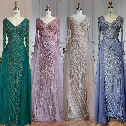 Dubai Mermaid Beaded Luxury Blue Muslim Evening Dresses Gowns with Detachable Skirt 2025 For Women Party LA71750