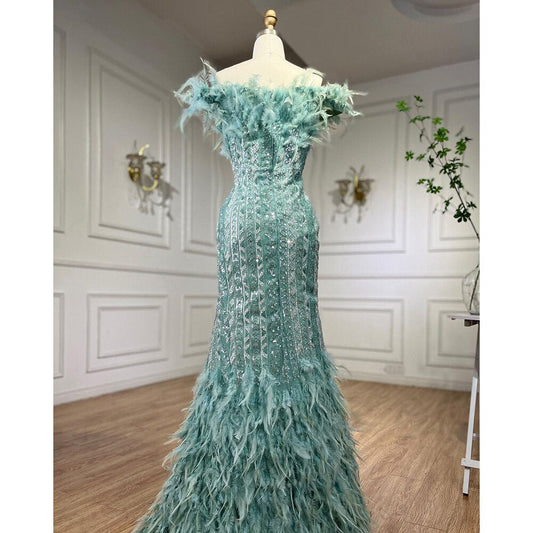 Dubai Mint Luxury Crystal Feathers Sexy Mermaid Evening Dresses Formal Gowns For Woman Wedding Party 2025 LA72095