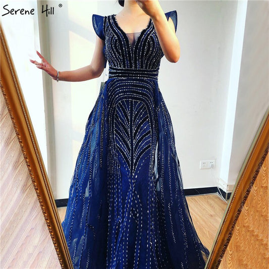 Dubai Navy Blue Deep-V Sexy Evening Dresses 2025 Sleeveless Crystal Luxury Mermaid Evening Gowns Design LA70198