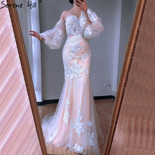 Dubai Nude White Mermaid Sexy Wedding Dresses 2025 Lantern Sleeve Flowers Beading Bridal Gowns LA70417 Custom Made