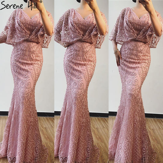 Dubai Pink V-Neck Pearls Lace Evening Gowns 2025 Half Sleeves Mermaid Sexy Elegant Formal Evening Dresses LA70156