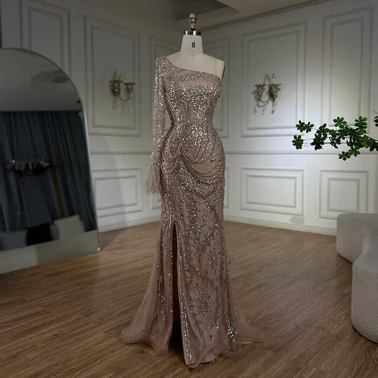 Dubai Nude One Shoulder Luxury Beaded Feathers Split Mermaid Evening Dresses Gowns for Women Party Gown LA72353
