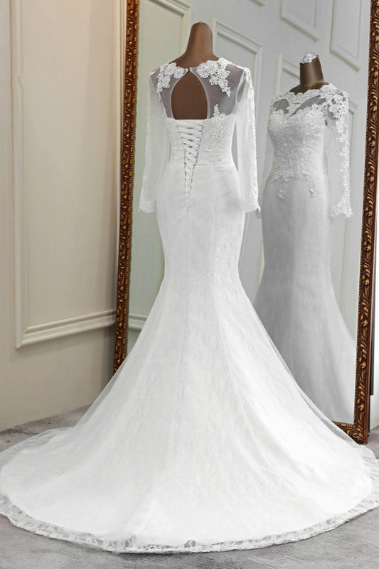 Elegant Long Mermaid Tulle Jewel Wedding Dress with Sleeves