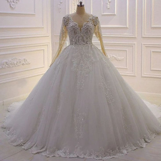Elegant Princess A-line Tulle V-neck Lace Wedding Dress With Long Sleeves