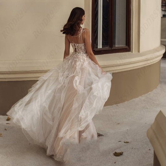 Elegant Spaghetti Straps Wedding Dress Sexy Lace Up Backless Robe De Mariée Romantic Square Collar Tulle Bridal Gowns