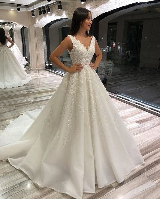Glamorous Long A-line V-neck Sleeveless Lace Wedding Dress