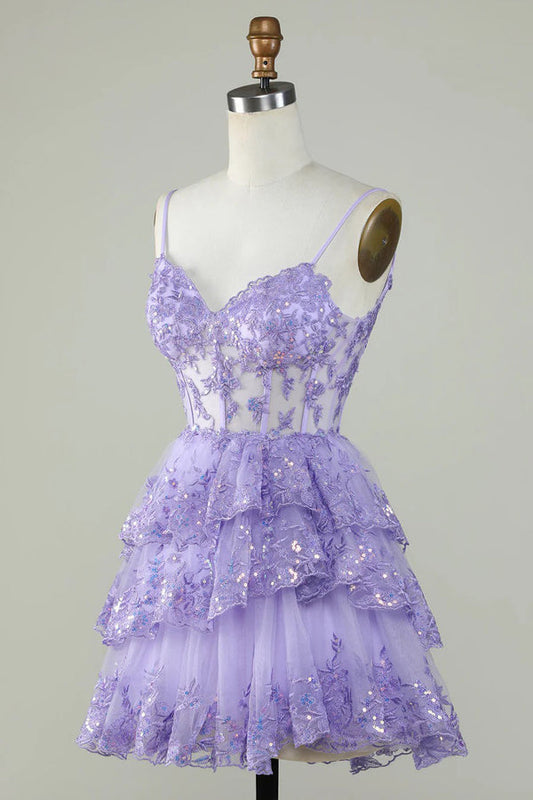 Glitter Lace Corset Ruffle Tiered Lavender Homecoming Dress PD503