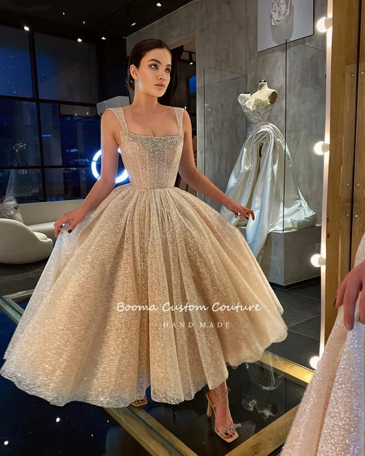 Glitter Tulle Midi Prom Dresses Spaghetti Straps Boned Tea-Length A-Line Wedding Party Dresses Formal Evening Gowns