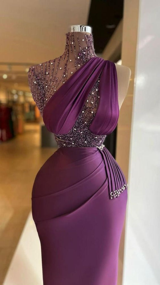 Gorgeous Mermaid One Shoulder Sleeveless Sequined Satin Prom Dress