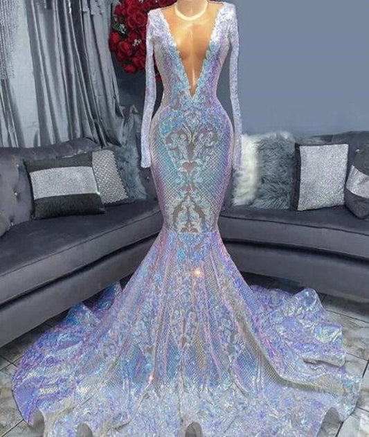 Gorgeous Sequins V-neck Long Sleeve pattern Floor-length Mermaid Prom Dresses