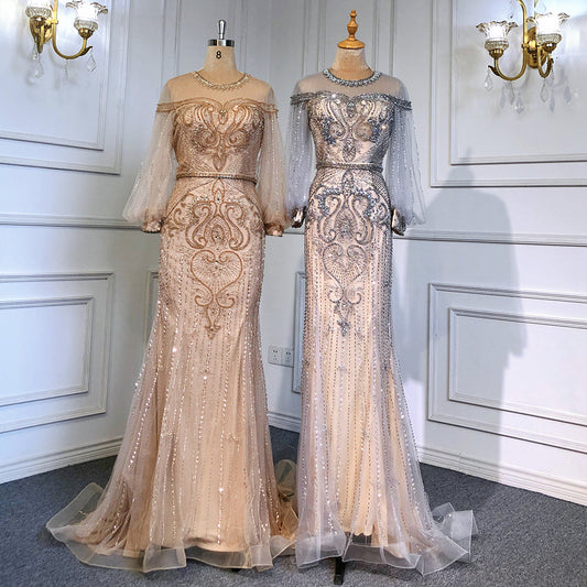 Grey Nude Luxury Evening Dresses Gowns 2025 Beaded Lantern Sleeve Mermaid Elegant For Women Party LA71603