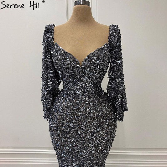 Grey Sliver Luxury Evening Dresses Gowns 2025 Elegant Sexy Flared Sleeves For Woman Party LA71178