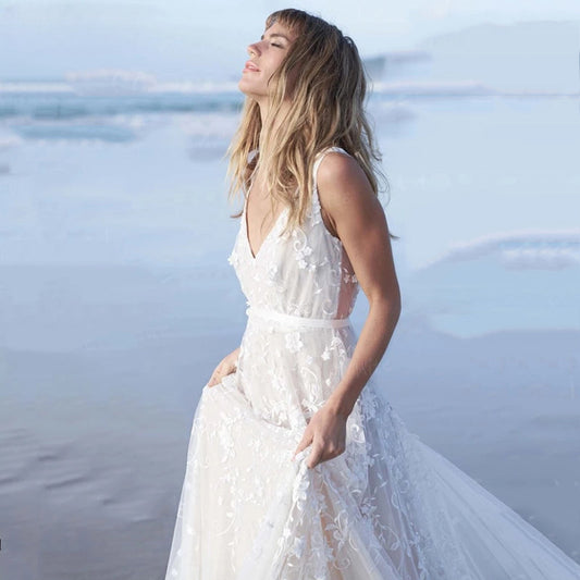 Illusion Tulle Beach Wedding Dress Charming Backless Appliques Bridal Gowns Deep V-Neck Spaghetti Straps vestido de noiva
