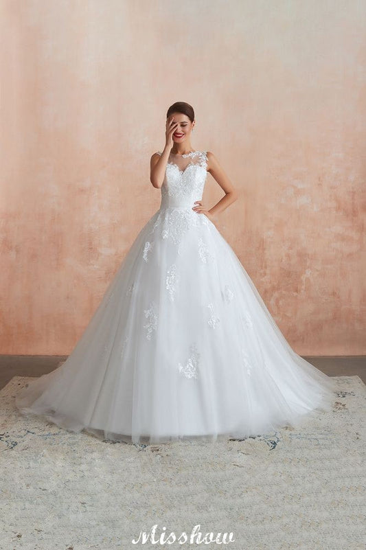 Illusion Neck White Wedding Dress Sleeveless Lace Appliques Bridal Gown online