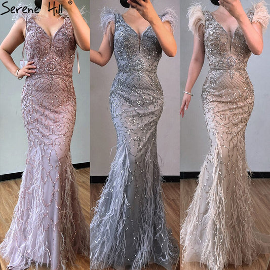 Lilac Mermaid V-Neck Evening Dresses 2025 Feathers Beading Luxury Sexy Formal Dress LA70572