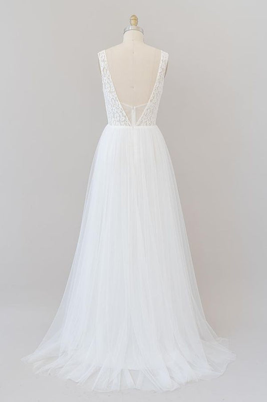 Long A-line Open Back V-neck Lace Tulle Wedding Dress