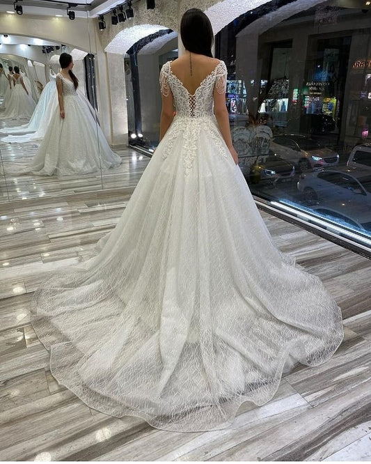 Long A-line Straps V-neck Floral Beads Tulle Backless Wedding Dress