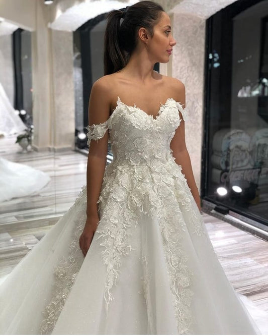 Long A-Line Sweetheart Off-the-Shoulder Appliques Lace Tulle Wedding Dress