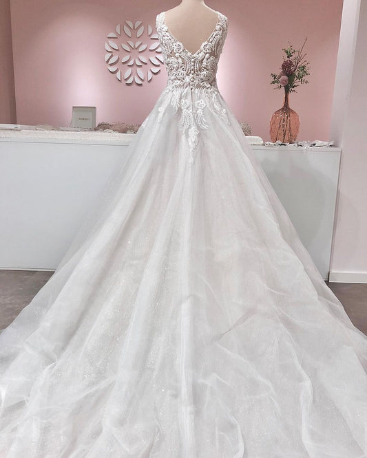 Long A-line V-neck Appliques Lace Tulle Wedding Dress