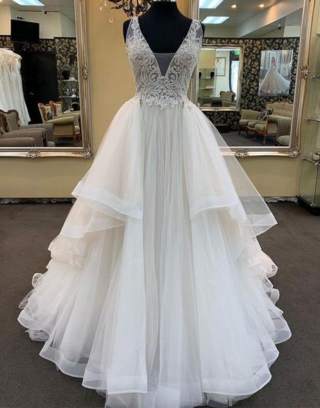 Long A-line V-neck Tulle Lace White Ruffles Wedding Dresses