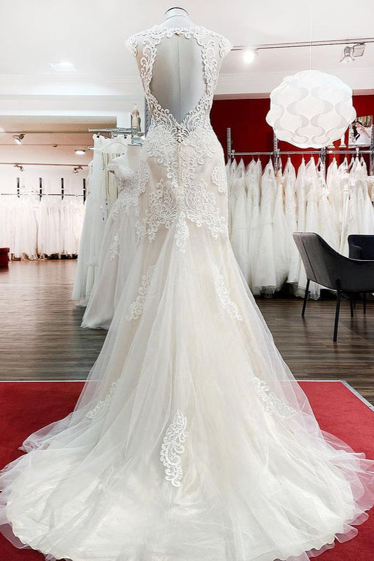 Long Mermaid Jewel Neck Chapel Train Tulle Lace Wedding Dresses