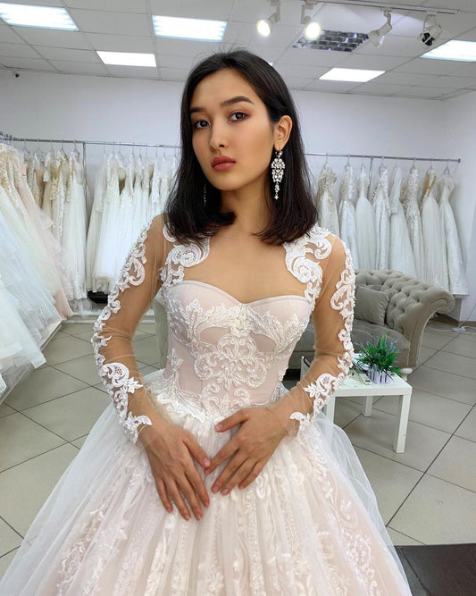 Long Princess Tulle Beads Appliques Lace Wedding Dress with Sleeves