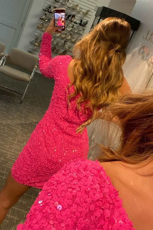 Long Sleeve Sequined Hot Pink Homecoming Dress SYH18