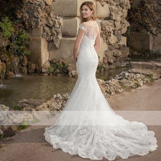 Mermaid Wedding Dress Women Charming Lace Appliques Bridal Gown Robe De Mariée Illusion Short Sleeves Gorgeous Boho