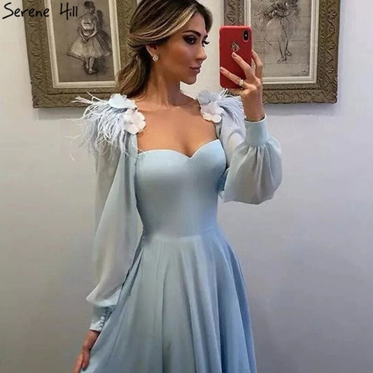 Muslim Blue Simple Evening Dresses Gowns 2025 Chiffon Ostrich Feather A-Line For Women Party HA2217