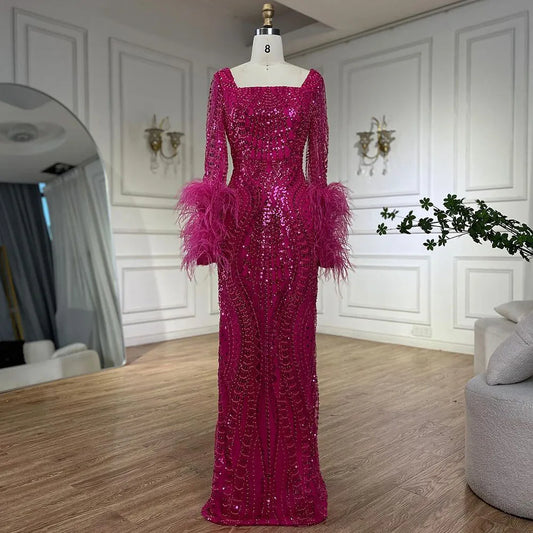 Muslim Fuchsia Luxury Beaded Feathers Mermaid Women Wedding Party Dubai Gowns Long Evening Dresses 2025 LA72565