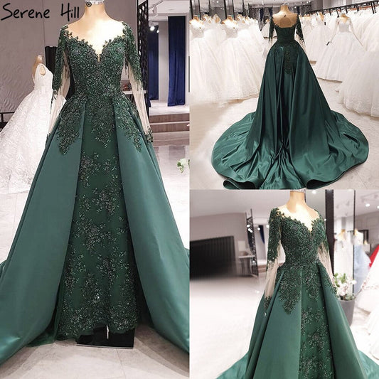 Muslim Green Mermaid Overskirt Evening Dresses Gowns 2025 Elegant Luxury Beaded Satin For Women Party LA71491