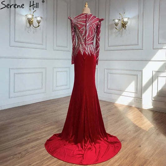 Muslim Mermaid Wine Red Evening Dresses Gowns 2025 Beaded Elegant Velour For Women Party LA71449