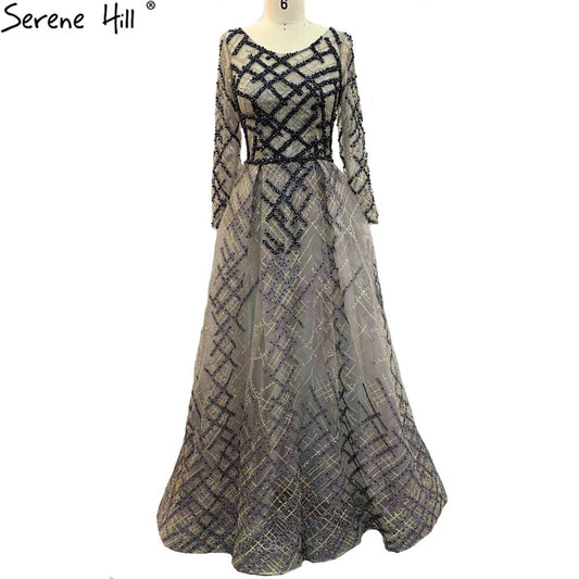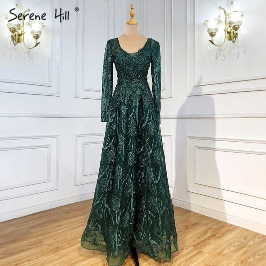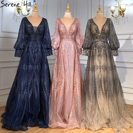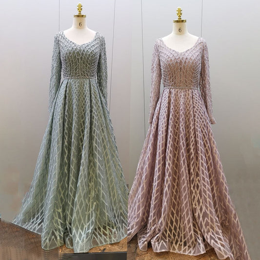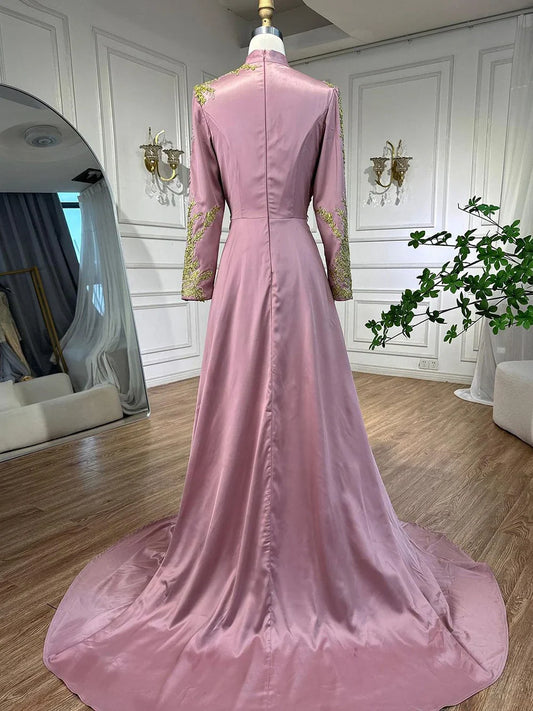 Muslim Pink Luxury Evening Dresses 2025 A-Line Beaded Long Sleeves For Women Party LA71311