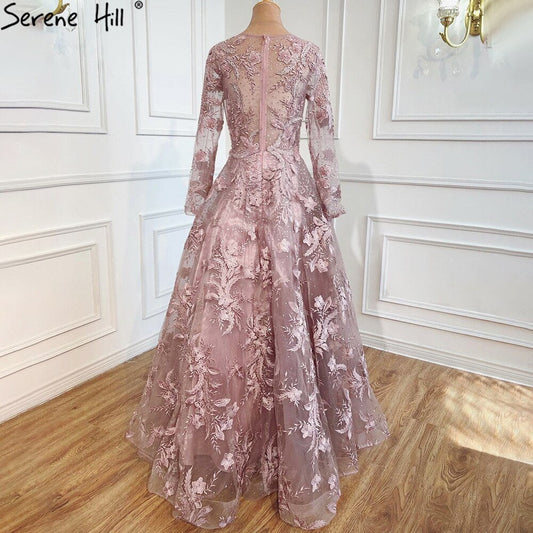 Muslim Pink Luxury Evening Gowns 2025 Flowers Crytsal Long Lantern Sleeves Formal Dress Design LA70779