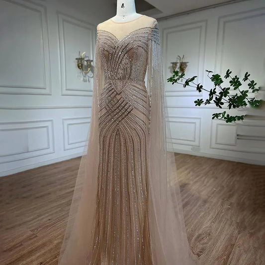 Nude Arabic Mermaid Cape Sleeves O-neck Beaded Evening Dresses Luxury Gowns 2025 For Women Wedding Party LA72012