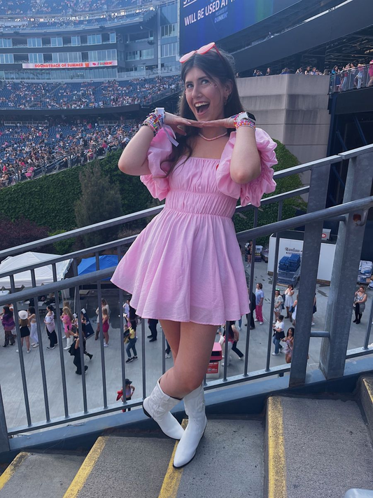 Pink A-line Square Neckline Party Dress Pink Puff Sleeves Homecoming Dress Y7174