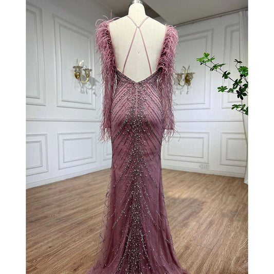 Pink Feathers Mermaid Elegant Long Evening Dresses 2025 Luxury Dubai Gowns for Women Wedding Party LA72116